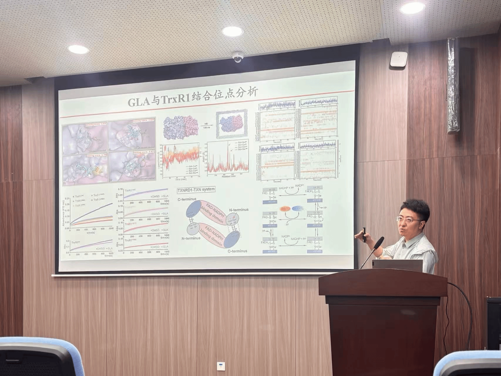 刘庆博教授在报告中,就地胆草中抗NSCLC活性的倍半萜、丹参中抗NSCLC活性的特异性二萜的研究、甘遂中抗NSCLC活性的巨大戟烷二萜的研究三个部分的研究工作进行了详细介绍,从先导物的发现、活性表征,再到结构优化后的药效提升,为我们提供了一个系统完善的天然药物发现机制模式和研究模板。报告最后,在座师生们与刘教授就天然药物发现过程中的痛点及难点问题进行了积极讨论,师生们也纷纷表示此次讲座为本领域的研究、学生课题的设计及推进提供了更广阔的思路,也为从天然产物中挖掘、开发更多先导物给了我们更多的信心。