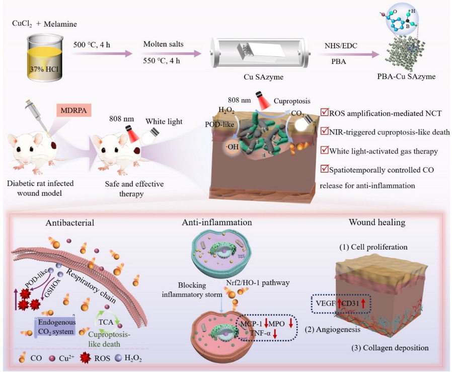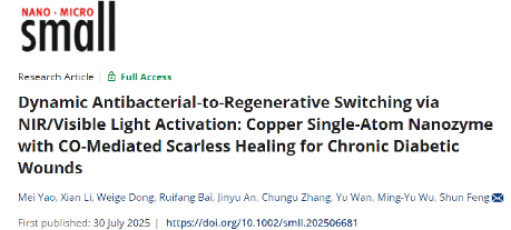 近日,工程技术杂志《Small》(JCR,Q1区,2025年影响因子12.1)正式发表了开云kaiyun网页版官网“生命分析技术与材料实验室”题为“Dynamic Antibacterial-to-Regenerative Switching via NIR/Visible Light Activation: Copper Single-Atom Nanozyme with CO-Mediated Scarless Healing for Chronic Diabetic Wounds”的研究成果。2023级博士研究生姚美为论文第一作者,封顺教授为通讯作者,西南交通大学为唯一通讯单位。