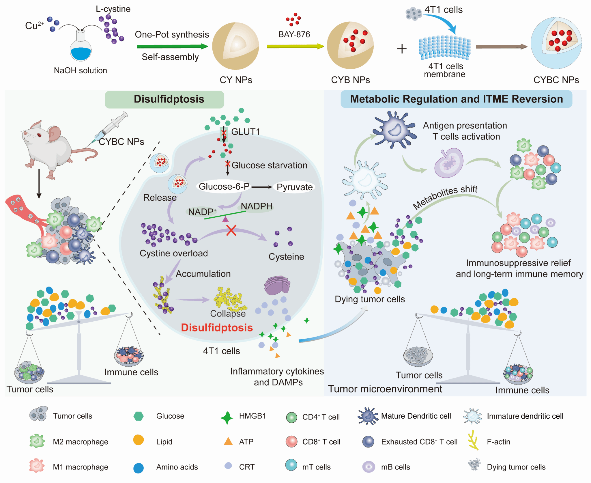 本研究构建了一种新型双硫死亡纳米诱导剂(CYBC NPs),由铜-胱氨酸纳米粒子负载葡萄糖摄取抑制剂BAY-876,并通过癌细胞膜伪装,实现对乳腺癌细胞的精准递送与选择性双硫死亡诱导。CYBC NPs可同步阻断葡萄糖摄取并外源补充胱氨酸,引发双硫死亡介导的细胞骨架坍塌,重塑肿瘤代谢流并触发免疫原性细胞死亡,从而促进树突状细胞成熟、M1型巨噬细胞极化及细胞毒性T淋巴细胞活化,逆转免疫抑制性微环境并显著抑制肿瘤生长。值得注意的是,CYBC NPs可诱发强大且持久的非耗竭性抗肿瘤免疫反应,建立长期免疫记忆,有效防止肿瘤复发与转移,彰显了双硫死亡在代谢调控与持续免疫治疗中的独特潜力。