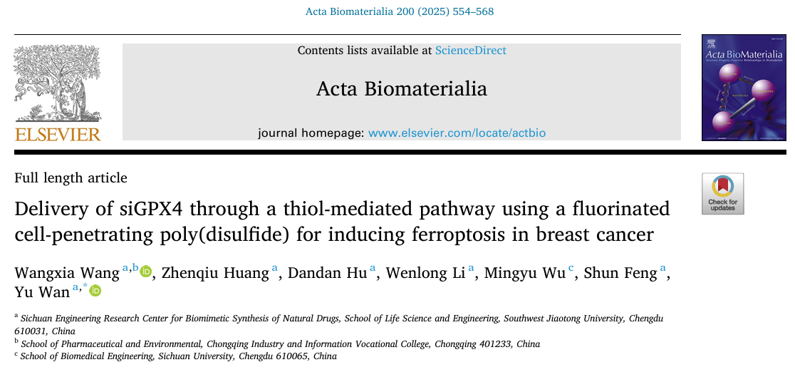 近日,本研究成果以“Delivery of siGPX4 through a thiol-mediated pathway using a fluorinated cell-penetrating poly(disulfide) for inducing ferroptosis in breast cancer”为标题发表在《Acta Biomaterialia》(JCR,Q1区,2025年影响因子9.6)上。生命科学与工程学院硕士研究生王旺霞为本文第一作者,万瑜副教授为本文通讯作者。