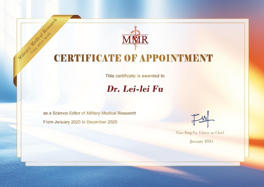 近日,开云kaiyun网页版官网符雷蕾副教授受Military Medical Research总编辑付小兵院士邀请,被任命为Military Medical Research(MMR)科学编辑。