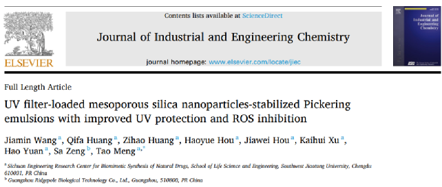 近日,“微纳生物技术”创新团队孟涛教授的最新研究成果:UV filter-loaded mesoporous silica nanoparticles-stabilized Pickering emulsions with improved UV protection and ROS inhibition(负载紫外过滤剂的介孔硅纳米颗粒稳定的Pickering乳液具有增强紫外保护和ROS抑制,DOI: 10.1016/j.jiec.2025.11.045)在国际权威期刊《Journal of Industrial and Engineering Chemistry》(JCR Q1分区)发表。该期刊由韩国化学工程师学会主办,在化妆品科学与技术领域享有盛誉,尤其在化妆品原料开发、配方设计、递送系统和功效评价等方向具有全球影响力,是化妆品领域技术创新与应用研究的重要发表平台。论文第一作者为生命科学与工程学院2023级硕士研究生王嘉敏,通讯作者为孟涛教授,西南交通大学为通讯单位,广州栋方生物科技股份有限公司为合作单位。