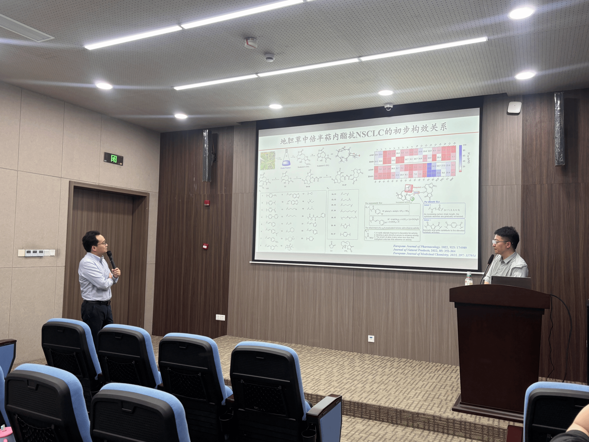 刘庆博教授在报告中,就地胆草中抗NSCLC活性的倍半萜、丹参中抗NSCLC活性的特异性二萜的研究、甘遂中抗NSCLC活性的巨大戟烷二萜的研究三个部分的研究工作进行了详细介绍,从先导物的发现、活性表征,再到结构优化后的药效提升,为我们提供了一个系统完善的天然药物发现机制模式和研究模板。报告最后,在座师生们与刘教授就天然药物发现过程中的痛点及难点问题进行了积极讨论,师生们也纷纷表示此次讲座为本领域的研究、学生课题的设计及推进提供了更广阔的思路,也为从天然产物中挖掘、开发更多先导物给了我们更多的信心。