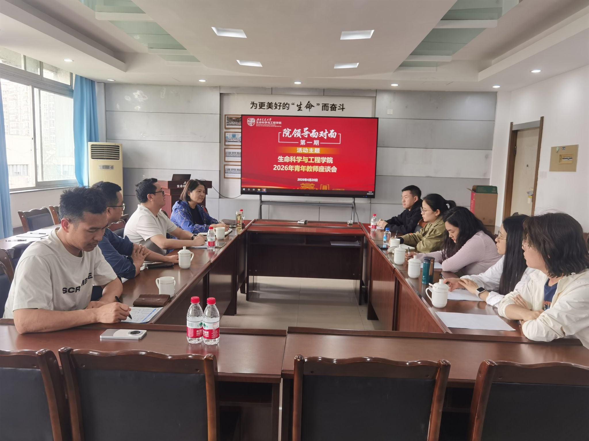 2026年4月20日下午14:00,生命学院院领导面对面2026年第一期活动在九里校区3609会议室举行,本期活动聚焦青年教师成长,参加座谈会的有学院近3年引进的青年教师代表6人,生命学院党委黄春蓉书记主持座谈会,副院长王毅、科研秘书陈伟、人事秘书赵钢锋参加座谈。